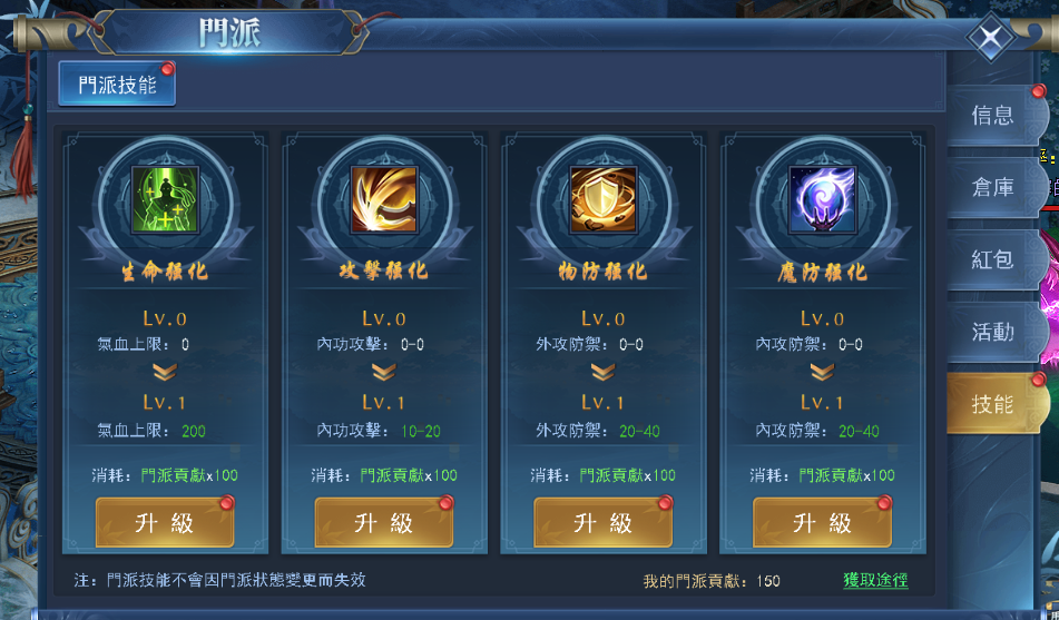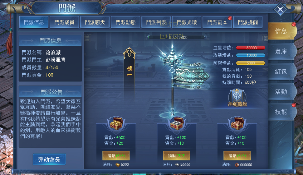 每天可進行捐獻增加幫派資金和獲取個人貢獻,貢獻可用來升級幫派技能。