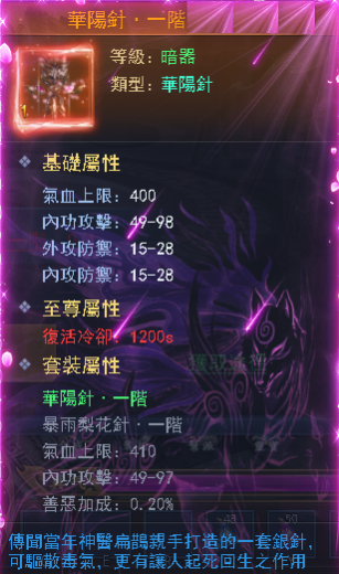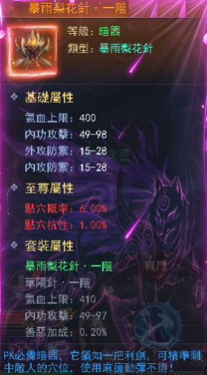 暗器是《劍嘯武林》行走江湖必不可少的物品,《劍嘯武林》到個各種暗器神秘而強大。初期我們可以接觸到3種暗器:暴雨梨花針、華陽針、飛天伸爪。