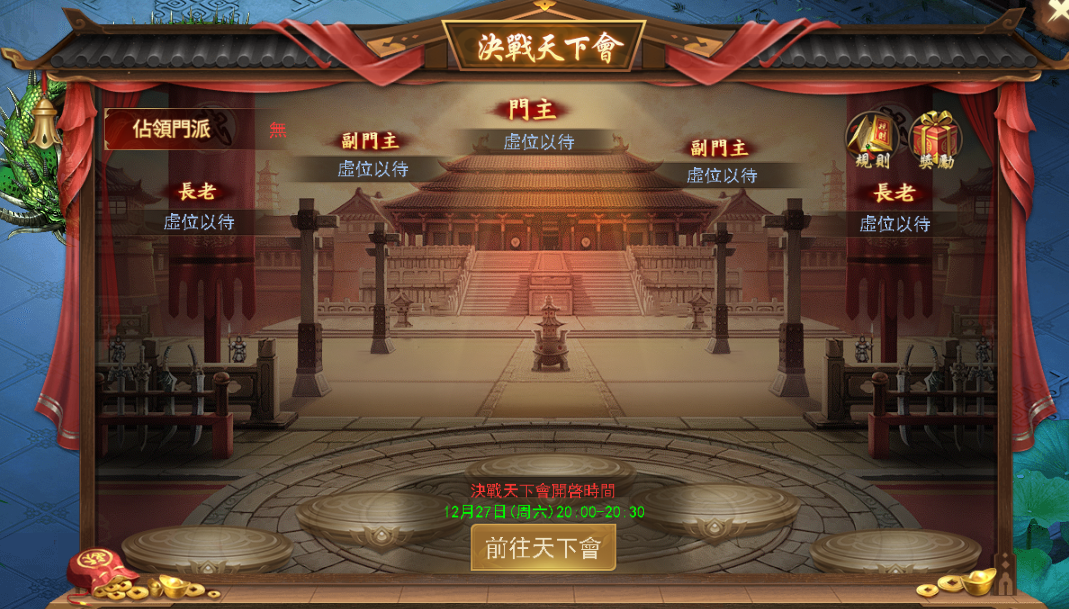 天下會決戰開始後,城內僅剩一個幫派成員可暫時佔領天下會,期間其他幫派可以搶奪佔領,攻城時間結束後,佔領天下城的幫派獲得天下會的歸屬。